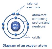 A hydrogen atom is made up of 1 proton at its core and 1 electron that revolves around the core in a three-dimensional orbit. An oxygen atom is made up of 8 protons and 8 neutrons at its core and 8 electrons that revolve around the core in 2 separate three-dimensional orbits. The inner orbit contains 2 electrons whereas the outer orbit contains 6 electrons.