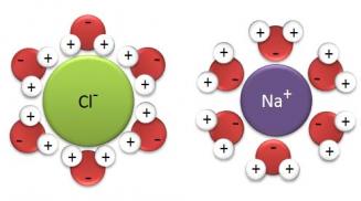 After salt is placed in water, the ionic bond between the sodium and chloride ions is broken due to the competitive action of the water molecules that outnumber the salt molecules. The electronegative oxygen pole of the water molecule is attracted to the positively charged sodium ions [Na+], and the electropositive hydrogen pole of the water molecule is attracted to the negatively charged chloride ions [Cl-].